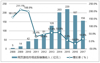 2008-2017年中國(guó)網(wǎng)頁(yè)游戲市場(chǎng)實(shí)際銷(xiāo)售收入及增速