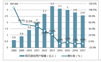 2008-2017年中國(guó)網(wǎng)頁(yè)游戲用戶規(guī)模及增速