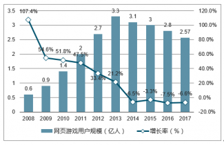 2008-2017年中國(guó)網(wǎng)頁(yè)游戲用戶規(guī)模及增速