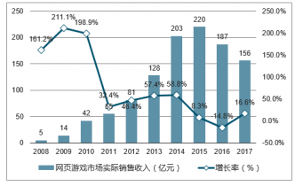 2008-2017年中國(guó)網(wǎng)頁(yè)游戲市場(chǎng)實(shí)際銷(xiāo)售收入及增速