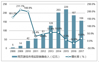 2008-2017年中國網(wǎng)頁游戲市場實(shí)際銷售收入及增速