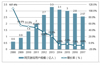 2008-2017年中國網(wǎng)頁游戲用戶規(guī)模及增速