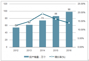 2012-2017年中國(guó)數(shù)據(jù)中心行業(yè)服務(wù)器投產(chǎn)數(shù)量及增長(zhǎng)趨勢(shì)