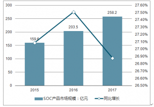 2015年,中國(guó)SOC產(chǎn)品市場(chǎng)規(guī)模為159.60億元,2016年市場(chǎng)規(guī)模增長(zhǎng)27.51%,達(dá)到203.50億元,到2017年,全年增長(zhǎng)至258.20億元。