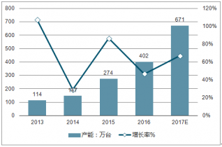 圖表:2013-2017年中國掃地機行業(yè)產(chǎn)能規(guī)模及增速分析