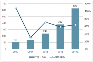 2013-2017年我國掃地機(jī)器人產(chǎn)量成快速增長的趨勢,平均增長率超過60%, 2016年產(chǎn)量382萬臺。2017年產(chǎn)量將增長到629萬臺。