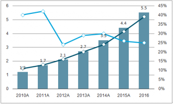 2010-2016中國出口電商增速及滲透