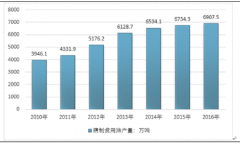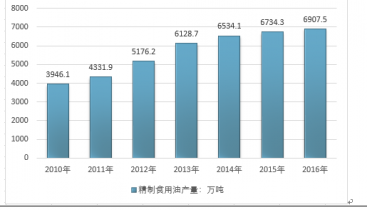 2015年中國精制食用油產(chǎn)量達(dá)到6734.3萬噸,2016年則在6907.5萬噸左右,同比增長2.57%。