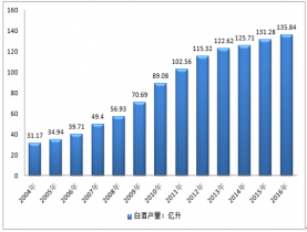 2004-2016年我國白酒產(chǎn)量走勢圖 |
