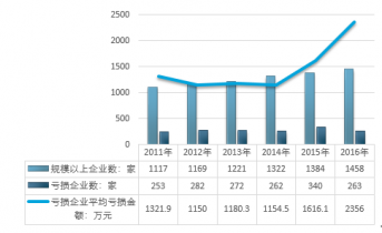 截至2016年我國計算機制造行業(yè)規(guī)模以上企業(yè)數(shù)量達1458家,當中263家企業(yè)出現(xiàn)虧損,虧損企業(yè)平均虧損金額為2356.0萬元。