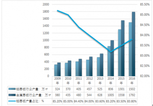2009-2016年我國鋁基板行業(yè)產(chǎn)量及占比金屬基板產(chǎn)量比重 |