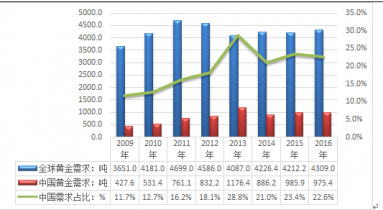 2009-2016年中國黃金消費(fèi)量占全球比重走勢圖 |