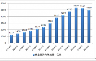 2015年我國珠寶首飾行業(yè)零售市場規(guī)模約5000億元,同比2014年的4920億元增長了1.63%,2016年我國珠寶首飾行業(yè)零售市場規(guī)模約4990億元,比2015年略微下降。近幾年我國珠寶首飾行業(yè)零售市場規(guī)模情況如下圖所示: