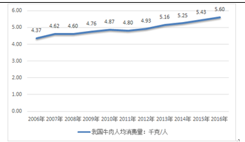 2006-2016年我國(guó)牛肉人均消費(fèi)量走勢(shì)圖 |