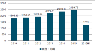 2010-2016年上半年中國汽車工業(yè)銷量情況