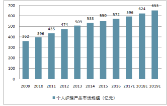 2009-2019中國個人護(hù)理產(chǎn)品市場規(guī)模(億元)