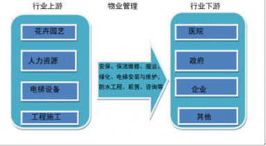 物業(yè)管理行業(yè)屬于服務(wù)型行業(yè),上游是人力資源、保潔用品、安防用品等行業(yè);下游直接客戶是房地產(chǎn)開(kāi)發(fā)企業(yè)、市政機(jī)關(guān)、醫(yī)療機(jī)構(gòu)、企業(yè)辦公、公共設(shè)施、學(xué)校、住宅小區(qū)等。
