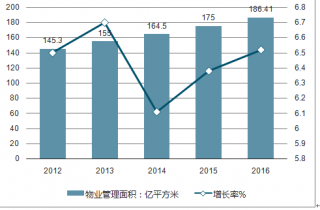 2012年以來(lái),我國(guó)物業(yè)管理面積不斷增長(zhǎng),由145.3億平方米增長(zhǎng)到2016年約186.4億平方米。