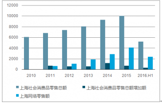 2010-2016上半年上海社會消費品零售總額與網(wǎng)絡零售額