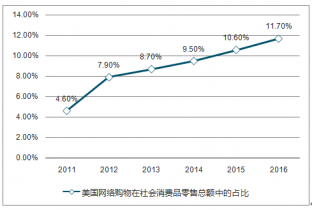 2011-2016年美國網(wǎng)絡購物在社會消費品零售總額中的占比