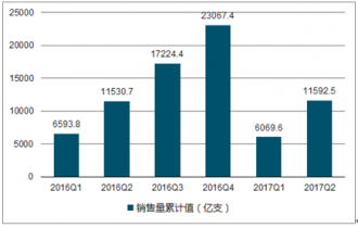 2019年1-6月中國卷煙銷售量累計為11592.5億支,同比增長0.54%。2016年中國卷煙銷售量累計為23067.4億支。