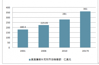 美國(guó)膳食補(bǔ)充劑市場(chǎng)的市場(chǎng)銷售額已從2001年的180.3億美元,增長(zhǎng)至2010年的281億美元,年均增長(zhǎng)率為5.1%。按照美國(guó)當(dāng)前的生活消費(fèi)水平和人口規(guī)模,預(yù)計(jì)該行業(yè)未來(lái)幾年內(nèi)保持4%的復(fù)合增長(zhǎng)率,2019年將達(dá)到361億美元的市場(chǎng)規(guī)模。