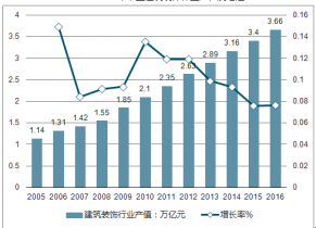 2005-2016年中國建筑裝飾行業(yè)產(chǎn)值及增速