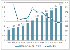 2005-2016年中國建筑裝飾行業(yè)產(chǎn)值及增速