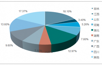 我國中成藥生產區(qū)域分布廣泛,其中,吉林占比份額最多,達到18.105,其次是四川和湖北,依次為13.6%和12.975。