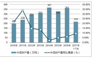2019年1-7月中國中成藥產量為219.7萬噸,同比增長9.3%;2016年中國中成藥產量為361.1萬噸,同比增長6.2%。