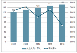 2012-2016年我國(guó)箱包行業(yè)從業(yè)人員及增長(zhǎng)率走勢(shì)