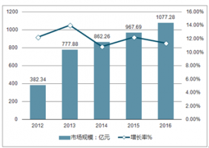 2012-2016年我國(guó)箱包行業(yè)市場(chǎng)規(guī)模及增長(zhǎng)率走勢(shì)