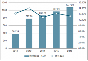 2012-2016年我國(guó)箱包行業(yè)市場(chǎng)規(guī)模及增長(zhǎng)率走勢(shì)
