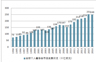 1994-2016年全球個人奢侈品市場發(fā)展?fàn)顩r(十億歐元)