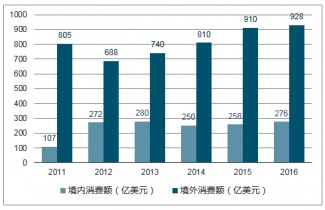 2011-2016年中國人境內(nèi)奢侈品消費(fèi)額走勢