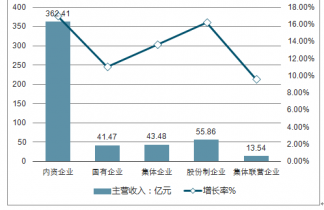 2016年我國商用廚具內(nèi)資企業(yè)主營業(yè)務(wù)收入為362.41億元,國有企業(yè)41.47億元,集體企業(yè)43.48億元,股份制企業(yè)55.86億元。
