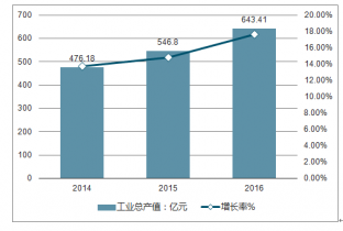 2014-2016年中國商用廚具行業(yè)工業(yè)總產(chǎn)值及增長率