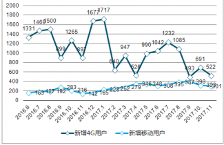 中國聯通2016年6月-2019年11月移動用戶增長情況(單位:萬)