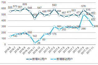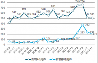 中國電信2016年6月-2019年11月移動用戶增長情況 (單位:萬)