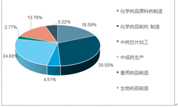 醫(yī)藥制造產(chǎn)業(yè)當(dāng)中化學(xué)藥品原料藥制造行業(yè)資產(chǎn)占比為18.59%;化學(xué)藥品制劑制造行業(yè)資產(chǎn)占比為30.50%;中藥飲片加工行業(yè)資產(chǎn)占比為4.51%; 中成藥生產(chǎn)行業(yè)資產(chǎn)占比為 24.65%;獸用藥品制造行業(yè)資產(chǎn)占比為2.77%;生物藥品制造行業(yè)資產(chǎn)占比為13.76%;衛(wèi)生材料及醫(yī)藥用品制造行業(yè)資產(chǎn)占比為5.22%。