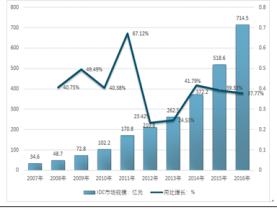 據(jù)統(tǒng)計,2007~2015年,中國IDC市場規(guī)模增長了接近20倍,年均增長率超過35%。2016年中國IDC市場規(guī)模已達714.5億元人民幣。