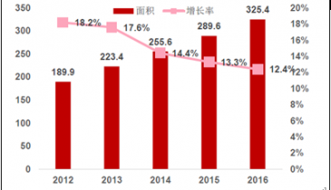 2012-2016年中國數(shù)據(jù)中心面積增長情況 |