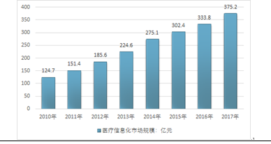近年來,我國醫(yī)療信息化產(chǎn)業(yè)呈現(xiàn)高速增長,年增長率在15%以上。2016年醫(yī)療衛(wèi)生行業(yè)的信息化市場規(guī)模達(dá)到333.8億元人民幣,比2015年增長10.38%,呈現(xiàn)高速增長的態(tài)勢。2019年我國醫(yī)療信息化市場規(guī)模達(dá)到375.2億元。
