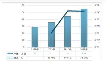 2014-2019年我國墨倉式打印機(jī)產(chǎn)量及增速走勢(shì)圖