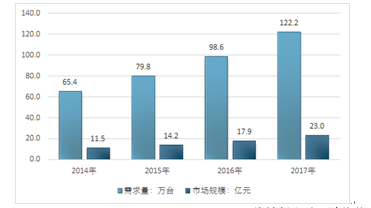 2014-2019年我國墨倉式打印機(jī)需求總量及規(guī)模走勢(shì)圖