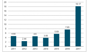 2012-2018美國數(shù)據(jù)中心投資規(guī)模(單位:十億美元)