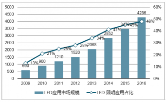 2009-2016 年中國LED 應(yīng)用市場規(guī)模及LED 照明應(yīng)用占比情況(單位:億元)