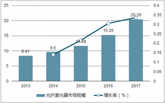 與其他激光器相比,光纖激光器擁有結構簡單、轉換效率高、光束質量好、維護成本低、散熱性能好等優(yōu)點,光纖激光器已成為金屬切割、焊接和標記等傳統(tǒng)工業(yè)制造領域的主流光源,并廣泛應用于醫(yī)療美容、航空航天和軍事應用等領域。全球光纖激光器收入從 2013 年的 8.41 億美元, 增加至 2017 年的 20.39 億美元,年復合增長率為 24.78%,保持快速增長態(tài)勢。 2013-2017 年,光纖激光器市場規(guī)模如下圖: