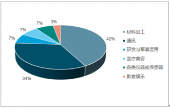 激光器用途十分廣泛,目前主要應(yīng)用于通訊、材料加工、研發(fā)與軍事運(yùn)用、醫(yī)療美容等領(lǐng)域。2017 年, 全球激光器行業(yè)應(yīng)用領(lǐng)域中材料加工相關(guān)的激光器收入 51.66 億美元,占全球激光器收入的 42%,超越通訊領(lǐng)域成為第.一大激光器應(yīng)用領(lǐng)域;研發(fā)與軍事運(yùn)用相關(guān)激光器收入 9.22 億美元,占全球激光器收入的 7%;醫(yī)療美容相關(guān)激光器收入 9.20 億美元,占全球激光器的 7%。具體情況如下: