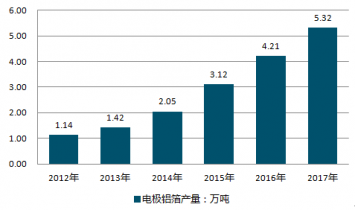 2012-2019年中國電極鋁箔行業(yè)產(chǎn)量情況